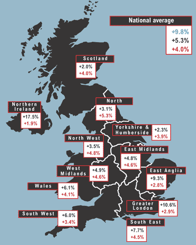 House price growth across the West Midlands looks set to ease over the second half of the year as demand slows once more. But weak supply across the region will ensure positive momentum for prices. Average property values are forecast to rise 4.9% this year. In Wales average house price growth is forecast to come in around 6.1% this year, making it one of the strongest UK regions. Start levels will continue to be buoyant. Greater London remains the strongest region, with property values predicted to climb 10.6% this year. But housing transactions will dip 6.1%, the weakest regional performance. Buying levels will remain historically high though, despite falling below the record numbers posted at the peak of the cycle in mid-2000. In the South East, build activity will dip a further 3.4% this year, the fourth successive year of declining activity. Private housing start levels are expected to remain disappointing in the South East for the next two years. Average property prices in Scotland are forecast to gain just 2% this year, the weakest regional performance in the UK. But DRI-WEFA believes the region is set for steady improvement, with average price rises of 5% forecast for 2002, buoyed by strong demand and improved regional economic performance.