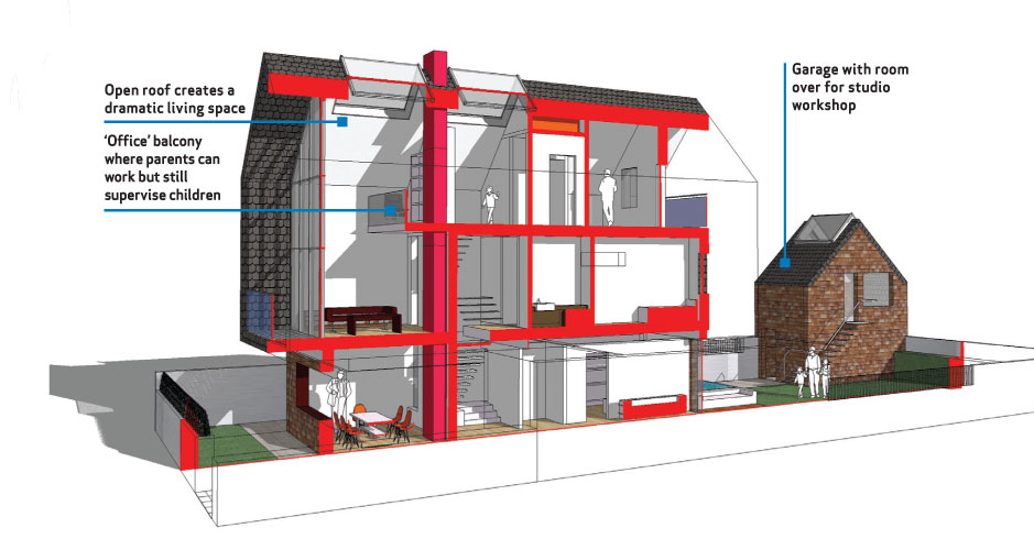 One approach, suitable for lower density housing in the region of 30-50 homes per hectare, is based on the repeated use of a generic barn-like structure on two or three floors, usually with a double height space for the living area. This creates the archetypal image of “home” with its pitched roof and gables and can be used in a wide variety of settings. These barns may stand alone in their most basic manifestation, but the addition of a variety of linking structures provides a large variety of permutations and combinations of additional space, and enables the basic type to be adapted for different layout requirements.