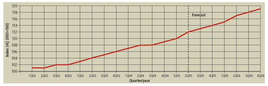 After a slowdown in the UK lift and escalator market during 2002 to 2003, the figures from 2004 show a marked increase that demonstrates the market is outperforming the forecast based on the G&T Tender Price Index National Average percentages. To remain ahead of the forecast, the market will have to show growth levels similar to 2004. This may well be possible during 2005 as building owners and operators continue to adjust to the impact of Part M of the Building Regulations. However, it is probable that, following this initial surge in new orders, growth levels will fall back to more modest levels between 3% and 4% in 2006.