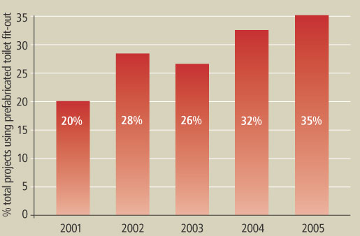 There are no published statistics as to the extent of the prefabricated market. However, a survey of large new-build commercial office projects (more than 100,000 ft2) that Gardiner & Theobald has been involved with over the past five years reported that 20-30% of such schemes are using prefabricated toilet modules.