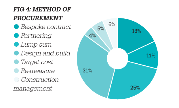 The idea that time management is a problem across the board is lent weight by the fact that the type of contract and procurement method was found to have little effect on the instance of delay. Of all the contracts considered in the research, the most commonly used form of procurement was design and build, accounting for almost a third of projects. Traditional lump-sum contracting came in next with a quarter of the total, while bespoke contracts accounted for 18% (Fig 4). The report concludes: ‘Bearing in mind the incidence of delayed completion across the board, it can reasonably be concluded that whilst different types of contract may shift the risk for default from one party to another, changes in the allocation of contractual obligations alone cannot secure timely completion.’