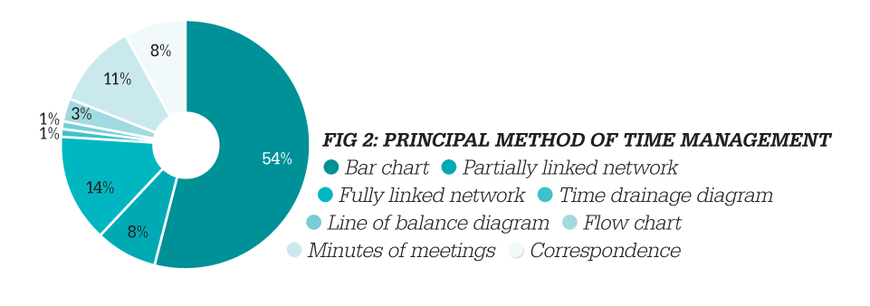 This is fortunate for the industry, because the research also found that very few projects are managed by reference to modern methods of time management. In 54% of cases, projects were managed using a simple bar chart for time management and only 14% of respondents had experience of a fully linked critical path network being used to manage the sequence and timing of the work (Fig 2). The report itself states: ‘It can be deduced from this that 86% of all respondents answering this part of the survey did not have the facilities to, and were thus unable to, identify promptly the likely effect upon the completion date of slippage or imposed changes in the work.’