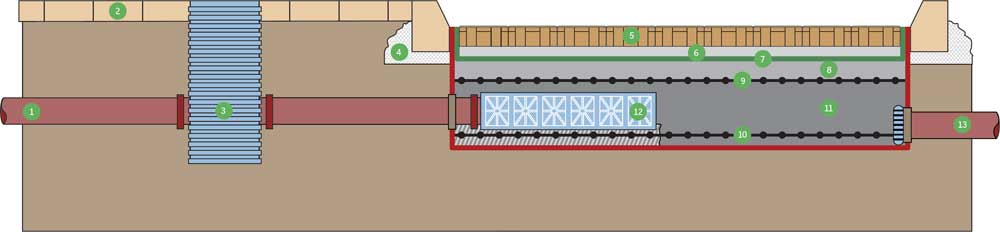 The rainwater is then filtered as it passes through the graded-stone bedding layer, sub-base and geo-textile membrane, before being slowly released into watercourses at a controlled rate to avoid overloading sewers and drains.