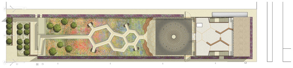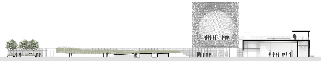 The Hive will be an extraordinary 14m x 14m x 14m three-dimensional cuboid latticed honeycomb structure supported on 3m high columns. Its centre will be hollowed out to form an accessible spherical void in which visitors will be able to experience the life of a bee colony. This sensory experience will be delivered in three different ways, visually, acoustically and by tactile means.