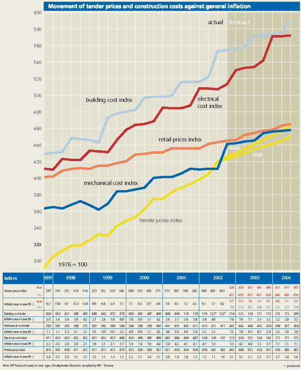 In contrast, the construction industry has enjoyed stable growth over this period and building tender prices have risen smoothly upwards. Analysis of tenders received in the third quarter this year shows that prices rose for the sixth consecutive quarter. The provisional Tender Price Index for 3Q02 stands at 420, registering a rise of 3.7% since the second quarter for competitively let construction work in the Greater London area, and a rise of 8.2% over the year. In the same periods, the Retail Prices Index has risen by just 0.3% over the quarter and 1.5% over the year.