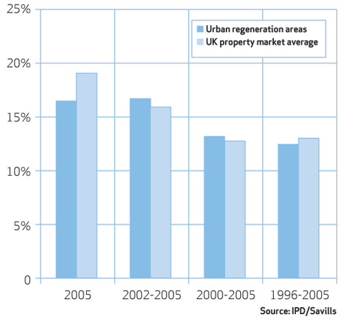 So what – to use a more common language among financiers – is regeneration’s bottom line? A look at the latest research from the Investment Property Databank and property agent Savills of a portfolio of 750 properties worth £5.4bn in regeneration areas across England and Wales shows that, in the past decade, returns from regeneration investments have mirrored those from the wider property market with 12.2% and 12.8% respectively [see graph above]. However, when you look over the last three and even five year periods, regeneration investments have actually outperformed those in other areas. So far so sensible, although as Brooks points out, regeneration projects are notoriously hard work from an investor’s point of view because of the lengthy timescales involved and the plethora of business models employed.