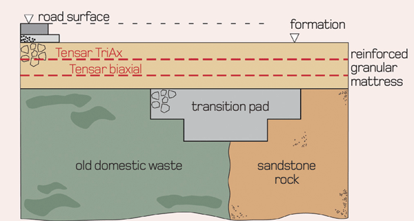 The solution involves a 600mm thick layer of aggregate with a heavy duty biaxial grid towards the bottom of a layer and the TriAx geogrid higher up to prevent the diagonal cracking.