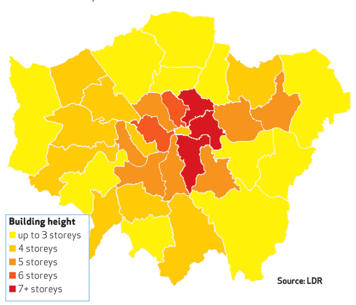 The report's assessment of planning permissions shows Tower Hamlets has most tall buildings. Across all London boroughs there are 31 buildings in the pipeline with 11+ storeys. Of these Tower Hamlets has 10 planned, with buildings ranging from 11 storeys to 48 storeys in height. As a result, average height for upcoming residential buildings in the borough is 10 storeys. Half of all tall residential buildings being developed in London are in the boroughs of Tower Hamlets and near neighbour Hackney. Tower Hamlets also records the second highest density level, after the City of London, with 497 homes per hectare, recording nine schemes with a density level of more than 900 units per hectare.