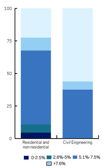 Civil engineering firms faced much stronger labour cost inflation than their building counterparts. Fifty-six per cent of respondents said inflation exceeded 7.6%, a significantly higher proportion than last quarter when less than 20% of responses fell into this band. Thirty-eight per cent of firms reported that labour cost inflation was running at between 2.6% and 5%.