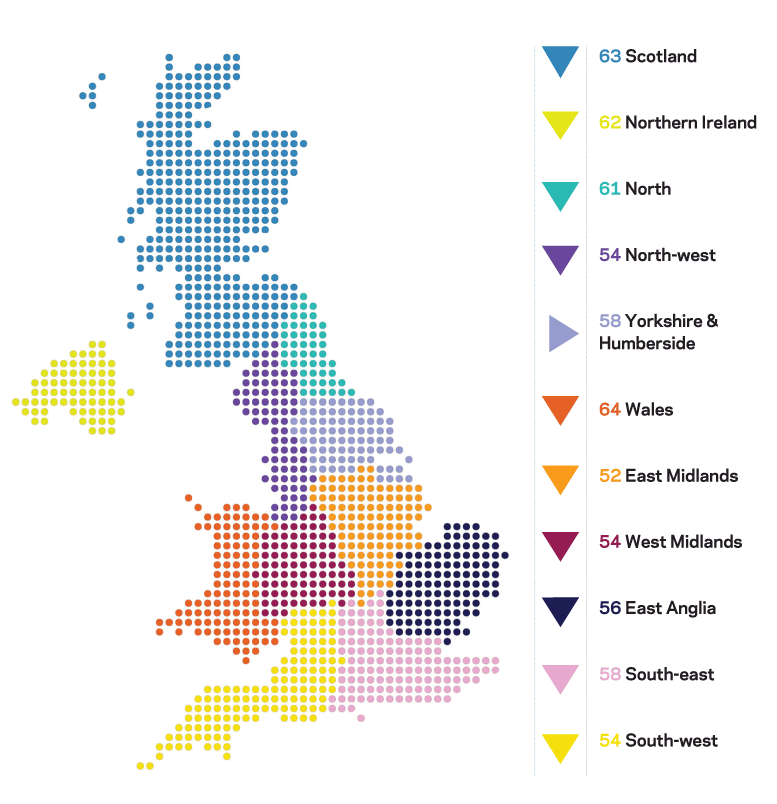 Indicators for Northern Ireland and the East Midlands also fell relatively sharply. A nine point decline lowered the Northern Ireland indicator to 62 and the East Midlands indicator fell by seven points to 52.