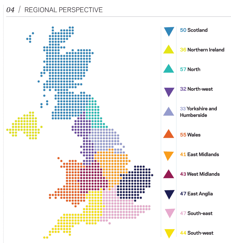 Wales saw the strongest improvement – its indicator rose six points to 55. The North-east also saw an increase, with its indicator up four points at 57.