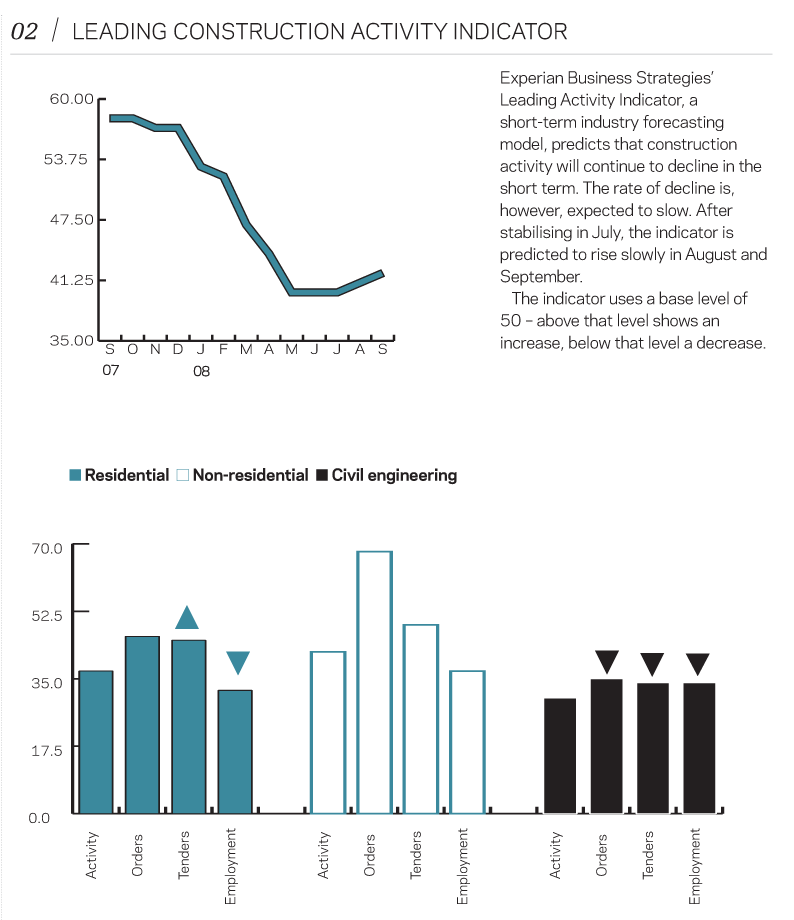 The non-residential sector once again showed the most resilience. Its activity index remained below 50 but orders and enquiries levels were stronger, possibly suggesting that better times are just on the horizon.