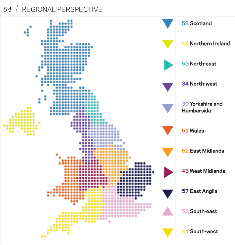 The composite indicator for East Anglia fell by two points, but at 57 it was still much stronger than the indicators for all the other regions. Scotland and the North-east were joint second, both standing at 53. The Scottish indicator was one point down on May and the North-east indicator was unchanged. The East Midlands indicator fell by six points to 52 and the Welsh indicator by four points to 51. The South-east was the only region to buck the declining trend. Its indicator rose by three points to 52.