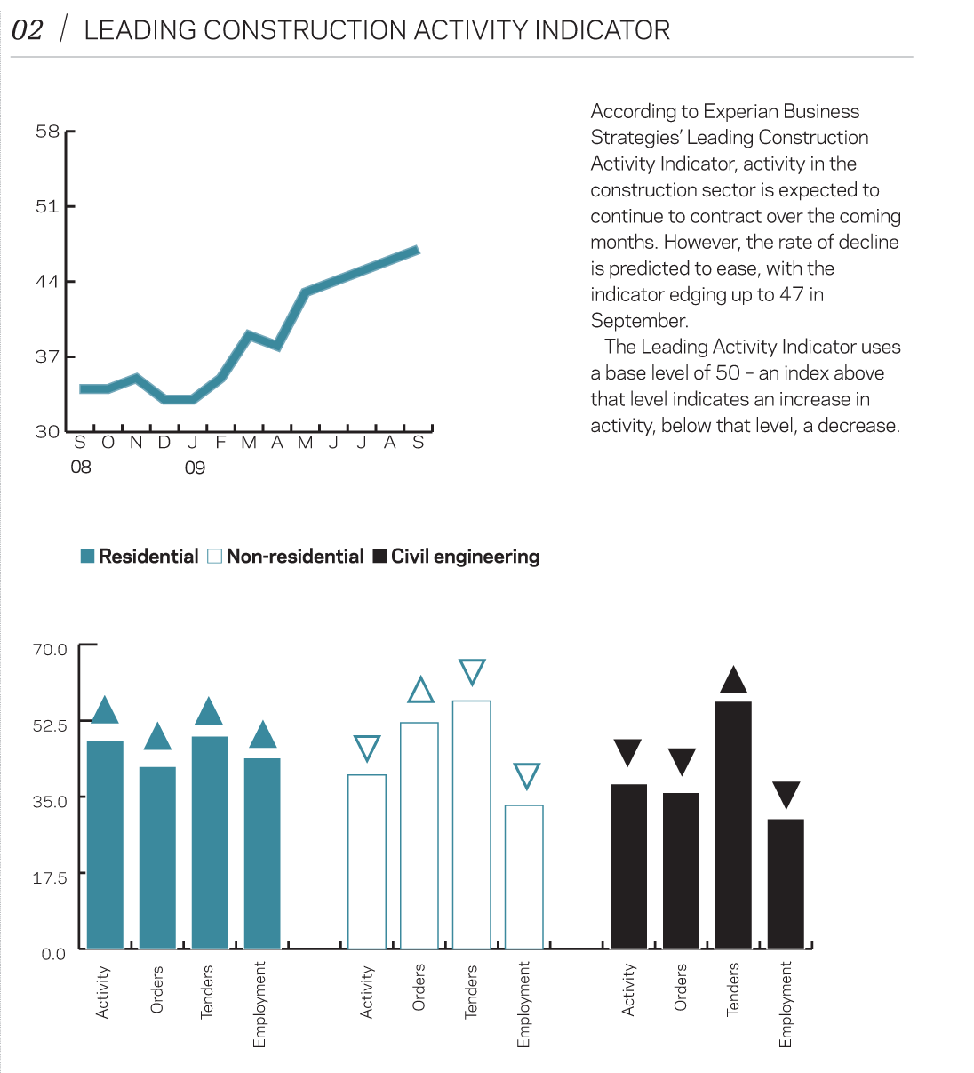 According to Experian Business Strategies’ Leading Construction Activity Indicator, activity in the construction sector is expected to continue to contract over the coming months. However, the rate of decline is predicted to ease, with the indicator edging up to 47 in September.