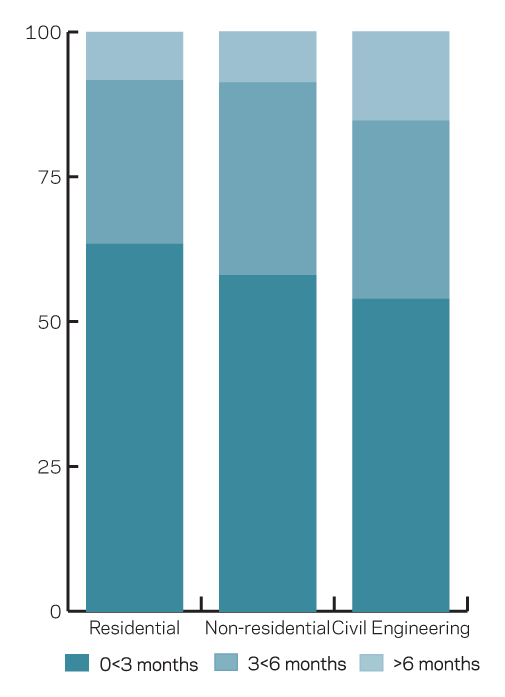 About 58% of non-residential firms reported that they had less than three months’ work accounted for by work in hand – this was compared with 49% in March. Civil engineering firms generally reported higher levels of work in hand than those in the other two subsectors, but almost 54% of companies in the sector still reported less than three months’ work already accounted for.