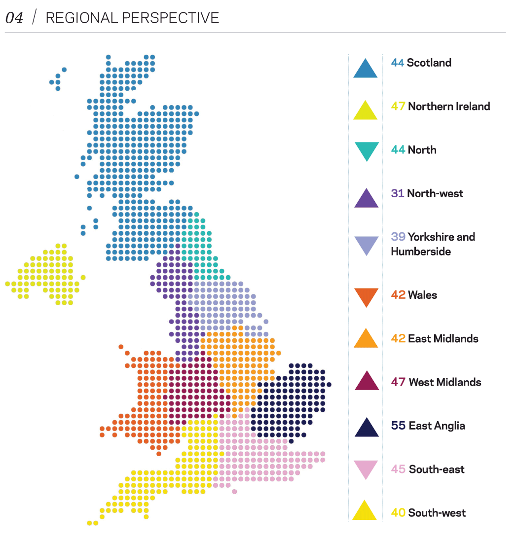 A two-point fall in the indicator for Yorkshire and Humberside took it to 39 and the North’s indicator was down three points at 44. The lowest indicator was again in the North-west, although at 31 it was two points higher than the previous month.