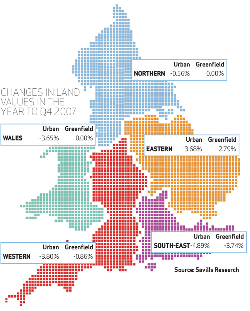 Research by Savills shows land values fell towards the end of 2007, as the credit crunch started to hit the headlines. Urban land suffered particularly, with the biggest drop, of almost 5%, recorded in the South-east. That was just the beginning, warns Barnes: “I’d expect urban land values to be down 12-15% by the end of this year, while greenfield values could be down up to 5% in some areas.”