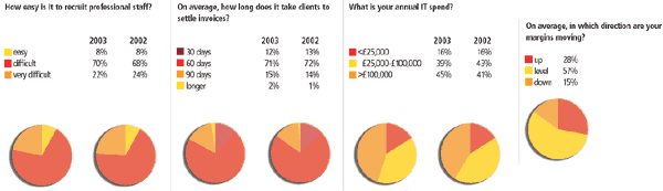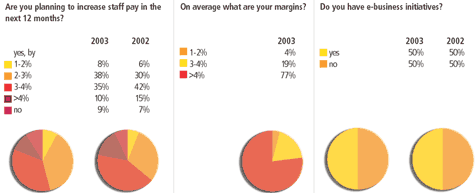 Nearly 500 firms were contacted for this year’s survey. They were asked for details on the number of chartered staff, non-chartered and technical staff, domestic and worldwide fee incomes and fees per employee. Practices were also asked questions relating to speed of invoice payment, staff recruitment, likely wage increases, margins, areas of work, e-business initiatives, and IT spend. The data in the tables and on the following page is taken directly from their replies. Total chartered staff figures are published exactly as provided by the firms. Where totals do not correlate to the breakdowns of chartered staff, this may be because of the inclusion in one set of figures but not another of staff who are not yet chartered.