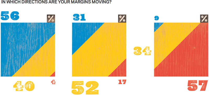 The survey results on the pie charts above and overleaf are probably a more up-to-date indicator of the sector’s health. They show that 57% of respondents are experiencing falling margins, in contrast to 2008, when most consultants thought they were heading upwards.
