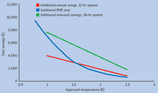 Indirect tower-based free cooling systems typically reject heat to the towers by means of a plate heat exchanger (phe) as depicted in figure 1. Consequently, the condenser and chilled water circuits are at no point interlinked during free cooling and the risk of increased fouling and corrosion associated with direct systems is avoided. The penalty for using a phe is an increase in the overall chilled water to wet bulb approach temperature, and a corresponding reduction in free cooling availability. It is therefore important to design for a minimal approach to maximise efficiency, while also taking into account the corresponding increase in phe cost that goes up exponentially as the approach is reduced. This point is illustrated in figure 2, from which it can be seen that an approach of 1·5 K provides the shortest payback for a typical system. However, designing for an approach of 1 K will be more effective in the longer term. This is especially true where the extra plates required to achieve this approach can be accommodated in the same phe frame size, and also in installations operating on a 24-hour basis. It should be noted that the high phe surface area associated with low approach temperatures can lead to reduced water turbulence, which in turn, may increase the potential for fouling. Consequently, it is important that the phe supplier is closely involved in the selection process.