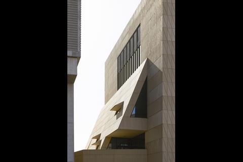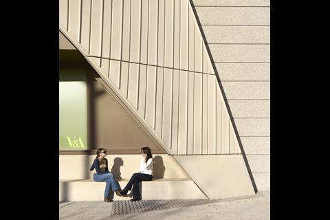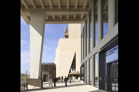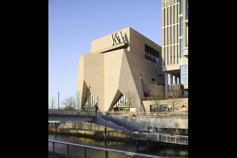 It is hard to miss. The new east London home for the Victoria & Albert Museum has not just one, but four large “V&A” signs on it – one mounted near the top, and one each above its entrances at the front, side and rear. The sand-coloured concrete panels on the angular facade are also arranged in a pattern that evokes the letters V and A, as are the pyramidical facets of the structure itself. The V&A brand is announcing its arrival in Stratford from every angle.