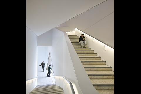 Between outer layer and internal core lies what the architects describe using the Japanese concept of “ma”: a negative space that is not merely empty, but full of meaning. It takes the form of a generous stairway with glimpses out of the building as you travel up and plenty of space for pause.
