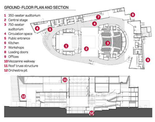 Rather than support the building on columns, which would have interrupted views inside theatre spaces, RVA proposed four huge concrete stair and lift cores located at the corners of the central performance area. These act like table legs, supporting a giant trussed roof structure, from which everything else is hung, including the façade, rehearsal and seminar rooms and the heavy equipment required for productions.
