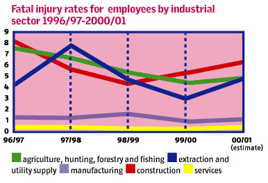 Fatal injury rates for employees by industrial sector 1996/97-2000/01
