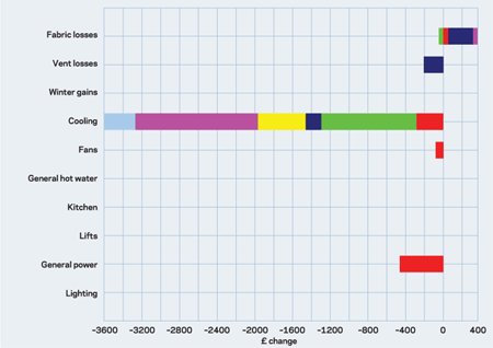 The savings on cooling dwarf the extra on heating, but this is partly because heating uses gas at 2p per kWhr, whereas cooling uses electricity at 6p per kWhr.