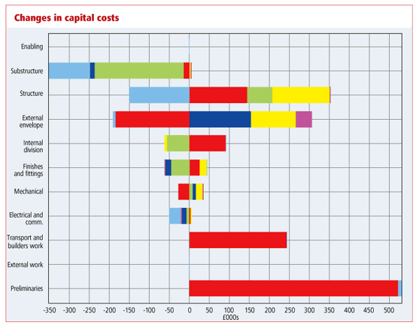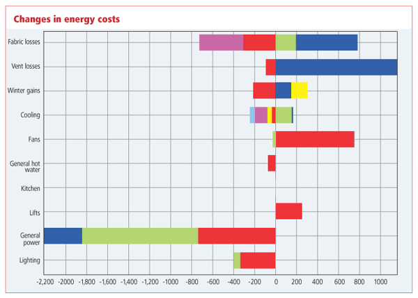 - Mechanical: Green denotes the wet riser in stair shafts. Blue (heating) and yellow (cooling) indicate increased design load capacities for each (see commentary on energy changes, opposite). These extras were mitigated by savings created by having less net and fewer people. The savings denoted by red are for fewer sanitary fittings and associated plumbing and disposal installation caused by fewer people, and less drainage under the building, because we have half the number of downpipes coming down to ground level. There are also cost changes in mechanical ventilation that do not show up on the graph as they all but cancel each other out: the extra is for stair shaft pressurisation (smoke extract) but also extra for lift motor rooms. However, these costs are mitigated by a reduction for deep plan ventilation in response to extra external wall. (Less area is more than 6 m from perimeter).