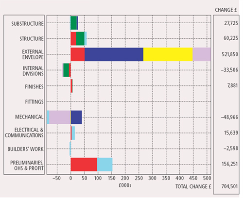 - Builders’ work Shown as a saving in light blue, this is based on a percentage of the services, and preliminaries are also based on a percentage. The effects on external works could be considered, but have been excluded, as this is site-specific. Preliminaries (red) are normally based on a simple but consistent percentage for strategic modelling purposes, although more refined methods may be used instead. Profits and overheads (light blue) are based on simple but consistent percentage allowances, although more refined methods may be used instead.
