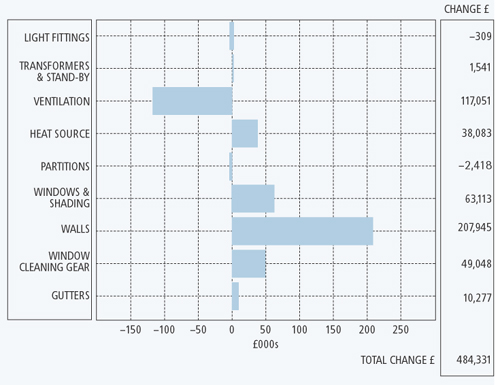 The explanation of changes in maintenance and replacement costs due to shape changes are similar to that for the change from deep to shallow plan. However, these changes overlap with effects due to the increased area. For example, lighting use is again assumed to reduce and lamp lives are 10% longer, but the extra area cancels out this saving.
