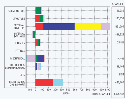 The program integrates fabric and building services components and can show how costs change when a building element is changed, such as increasing the proportion of glazing in the facade. It does this by providing a detailed breakdown of changes and shows the capital costs of physical items and the effect these have on building performance. Any changes to heating and cooling loads will be quantified in terms of the effect this has on chillers and electrical supply loads, for example.