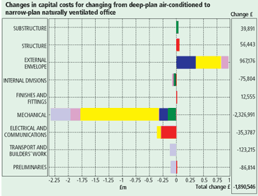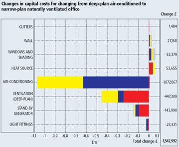 In summary, over 30 years, the combined effect for a change from a deep-plan air-conditioned office to a shallow-plan naturally ventilated office are: